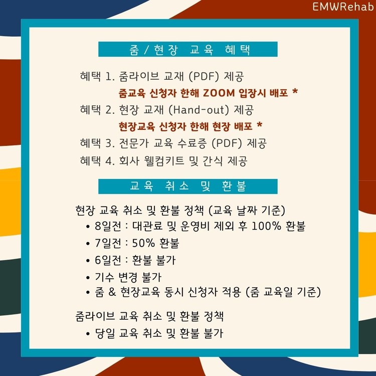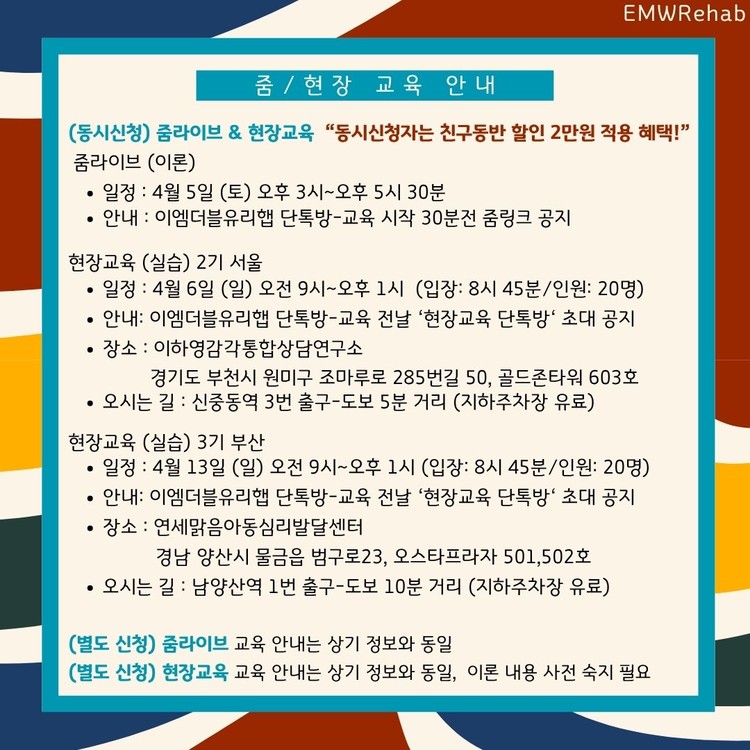 참고 사항 : 1. 친구동반 (2만원할인), 미션달성 (3만원 할인) - 현장교육 신청자에 한함, 중복 적용 가능, 카카오톡채널 인증 - 중복 적용시 줌/현장 동시 신청자 12만원 등록, 현장교육 신청자 8만원 등록 2. 줌/현장 별도 신청 가능, 단 현장 별도 신청은 기존 이론완성 수강자에 한함 3. 줌/현장 동시 신청자 중, 줌 일정 안 맞을시 카카오톡채널 문의 (현재 부산 줌라이브 교육은 녹화강의로 대체 제공) 4. 연멤버쉽회원 줌교육 20%-50% 할인, 현장 3만원 할인 적용 위해 카카오톡채널 문의 후 교육 신청, 기타 이벤트 중복 적용 가능