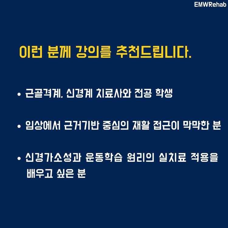 강의 대상자 : 운동학습과 신경가소성 원리 학습 및 근거 중심의 과제 중심적 재활치료 설계를 배우고 싶은 분