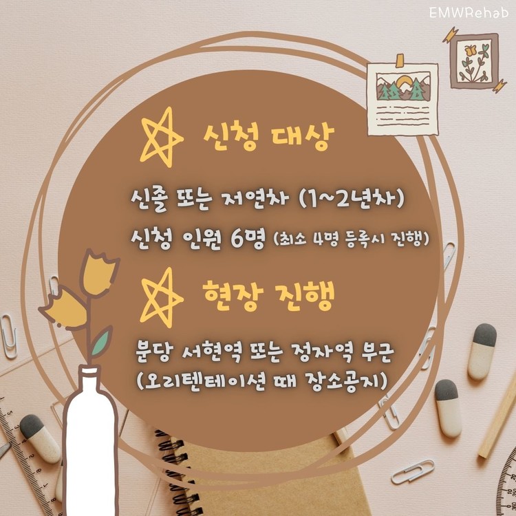 진행 장소 : 현장 진행 (분당 서현역 또는 정자역 부근, 오리엔테이션날 확정 안내)