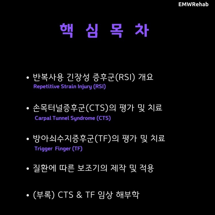 반복사용 긴장성 증후군(RSI)의 주요 질환인 손목터널증후군(CTS)과 방아쇠 수지 증후군(TF)의 평가, 치료방안, 보조기 제작 및 사용 방법을 습득할 수 있습니다.